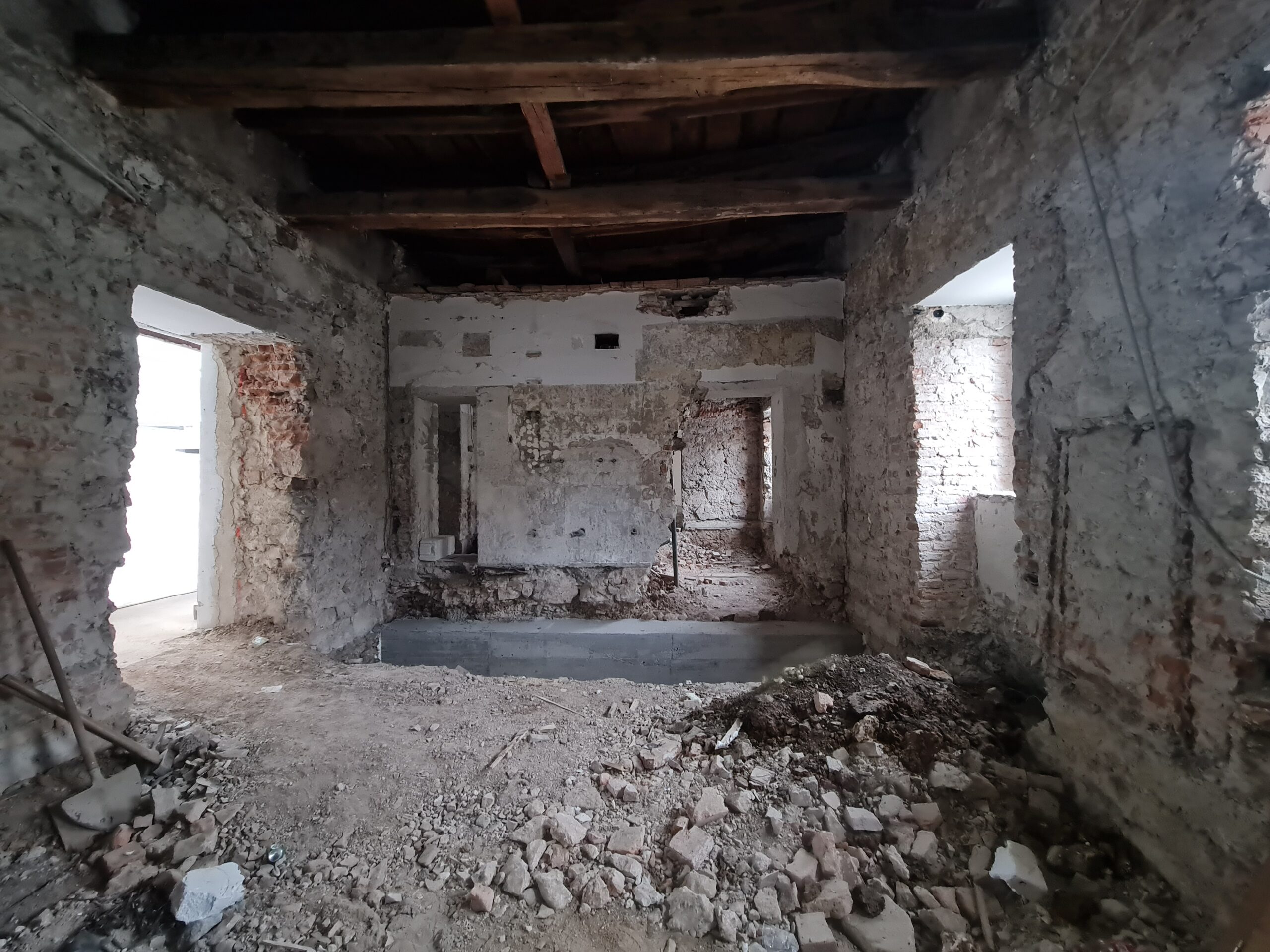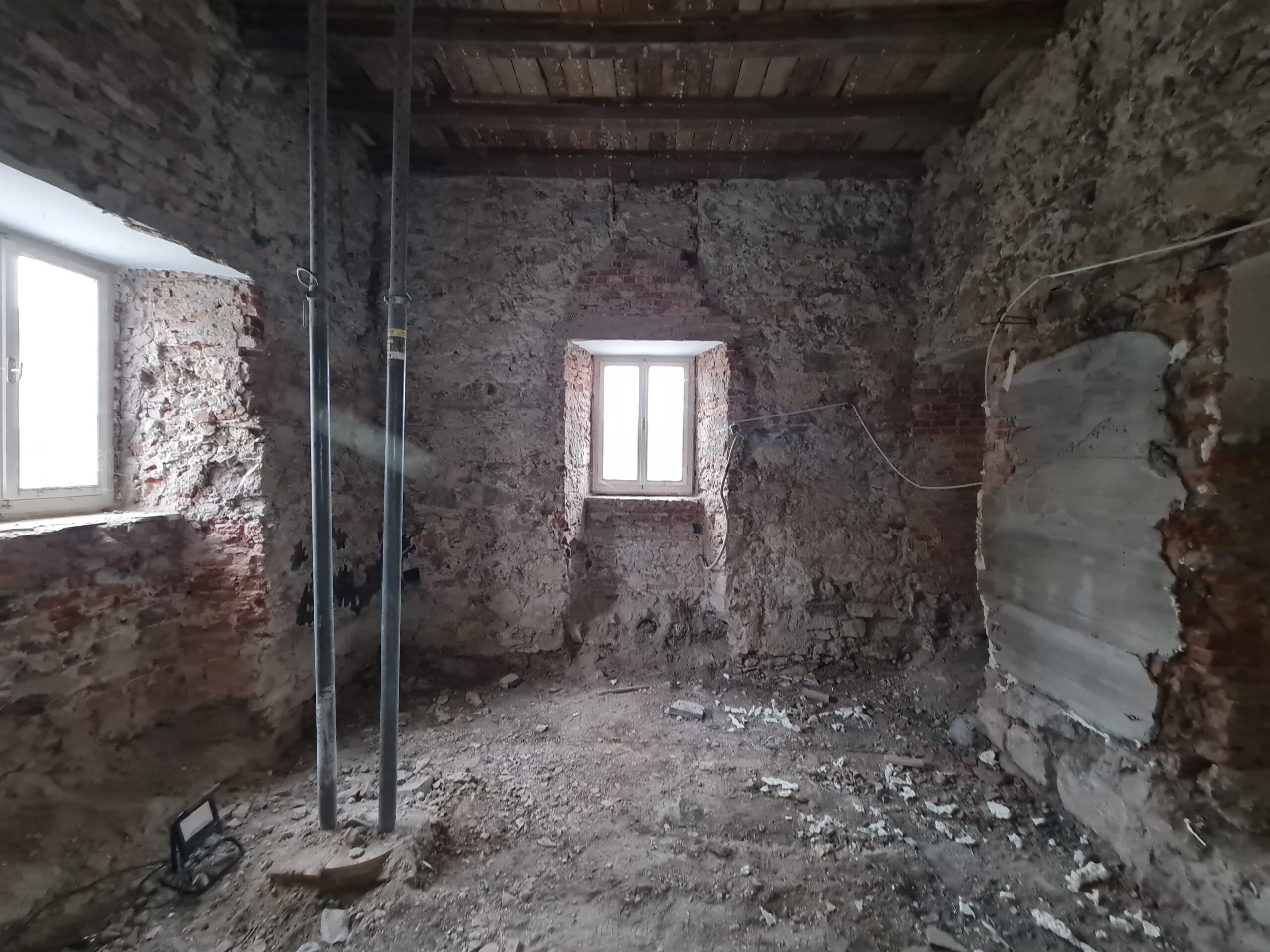 Hidrofobna bariera: Ena ključnih faz je bila izvedba zanesljive hidrofobne bariere proti kapilarni vlagi. Z namenskim nizkotlačnim injektiranjem smo ustvarili pregrado, ki dolgoročno preprečuje dvig vlage iz temeljev v nosilne zidove.