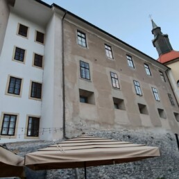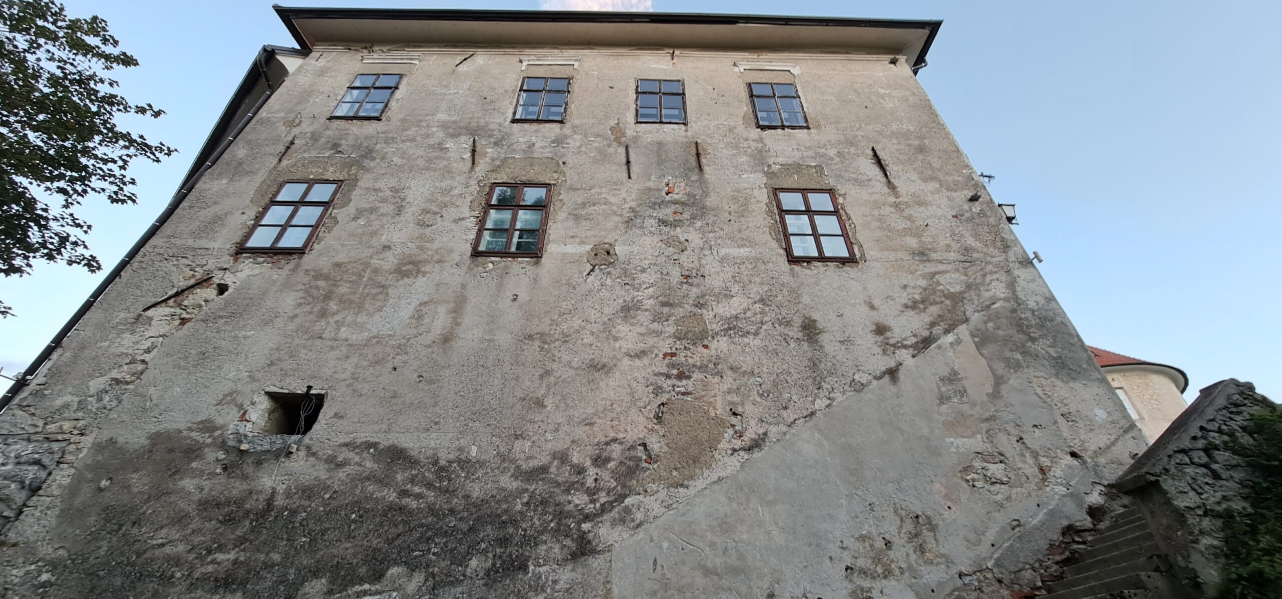 Protipotresne vezi in premostitve: Izvedli smo enostranske protipotresne vezi na južni in severni fasadi ter na južnem okroglem stolpu. Celoten sistem jeklenih vezi je po celotni trasi vključeval napenjalce. Pri okenskih odprtinah smo izvedli posebne premostitve z dodatnimi vezmi z zamikom nad ali pod okni, njihovi konci pa so bili zanesljivo kemijsko sidrani. Zaradi specifičnosti objekta uporaba klasičnih sidrnih plošč na vogalih večinoma ni bila mogoča, zato smo prenose sil na vseh vogalih reševali z močnim kemijskim sidranjem.