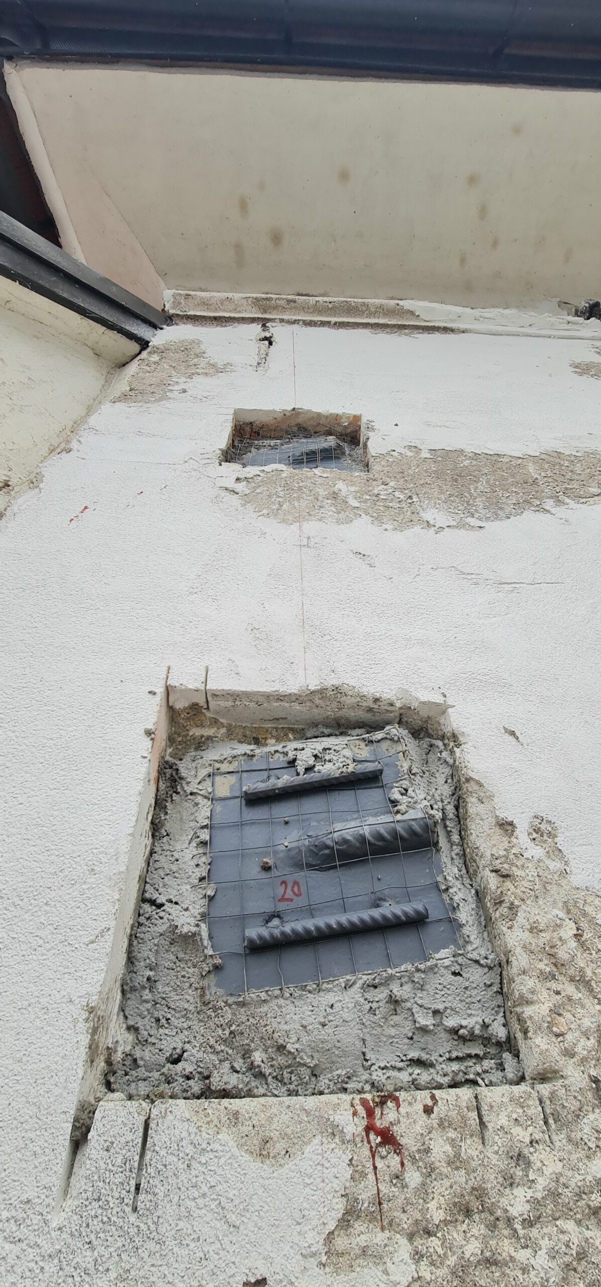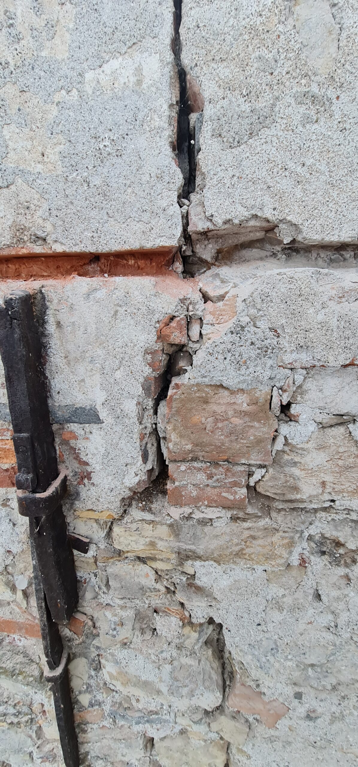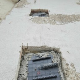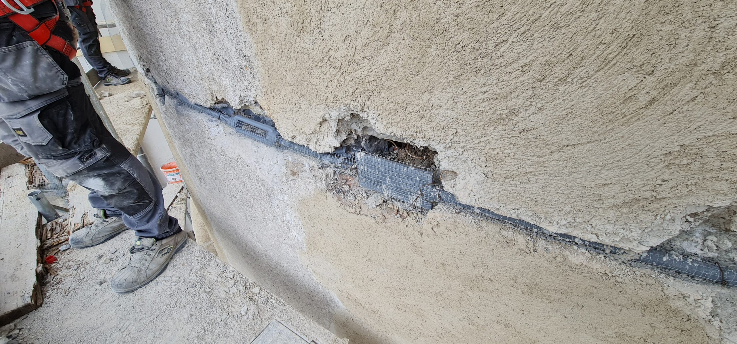 Šivanje vogalov: Strukturno šivanje vogala na severnem traktu je bilo izvedeno s pomočjo prefabriciranih jeklenih sider, izdelanih iz rebrastega betonskega jekla pod prilagojenim kotom. S pomočjo epoksidne smole smo ta sidra vgradili in utrdili vse do globine enega metra, kar zagotavlja trajnost in varnost pred potresnimi obremenitvami.